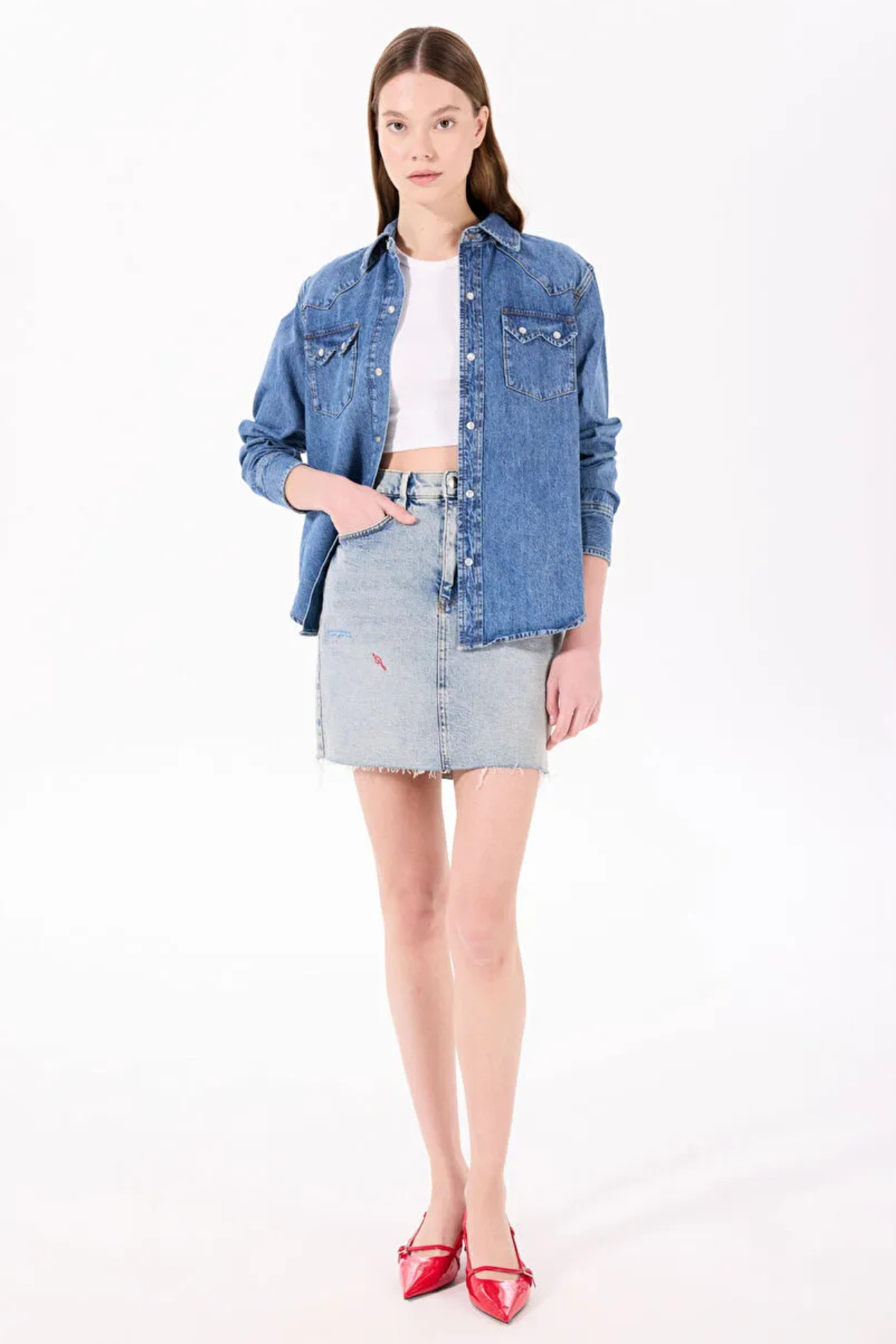 Regular Fit Nakışlı Açık İndigo Jean Etek (DT10350)