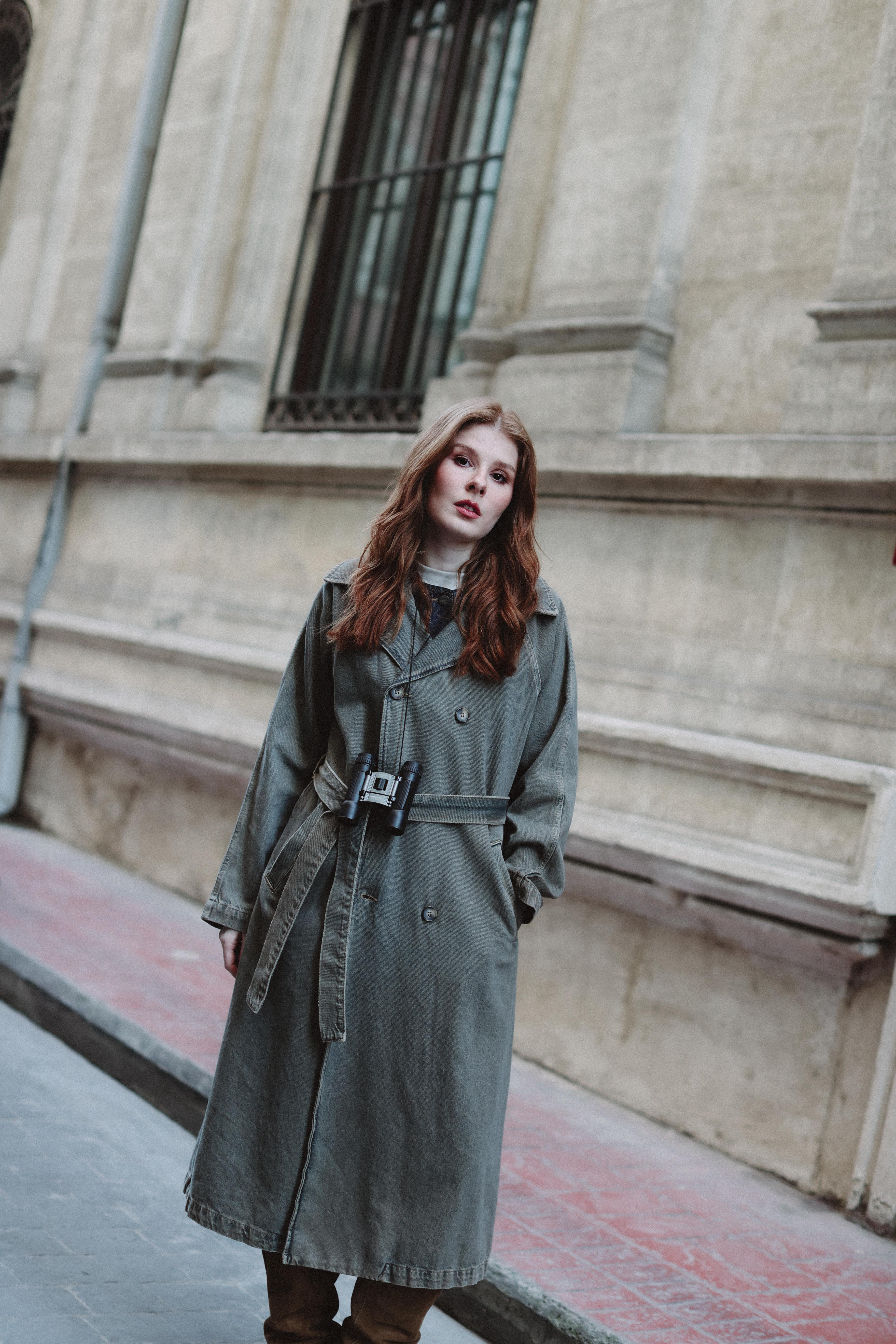 Oversize Fit Kuşaklı Düğmeli Yeşil Kadın Jean Trençkot